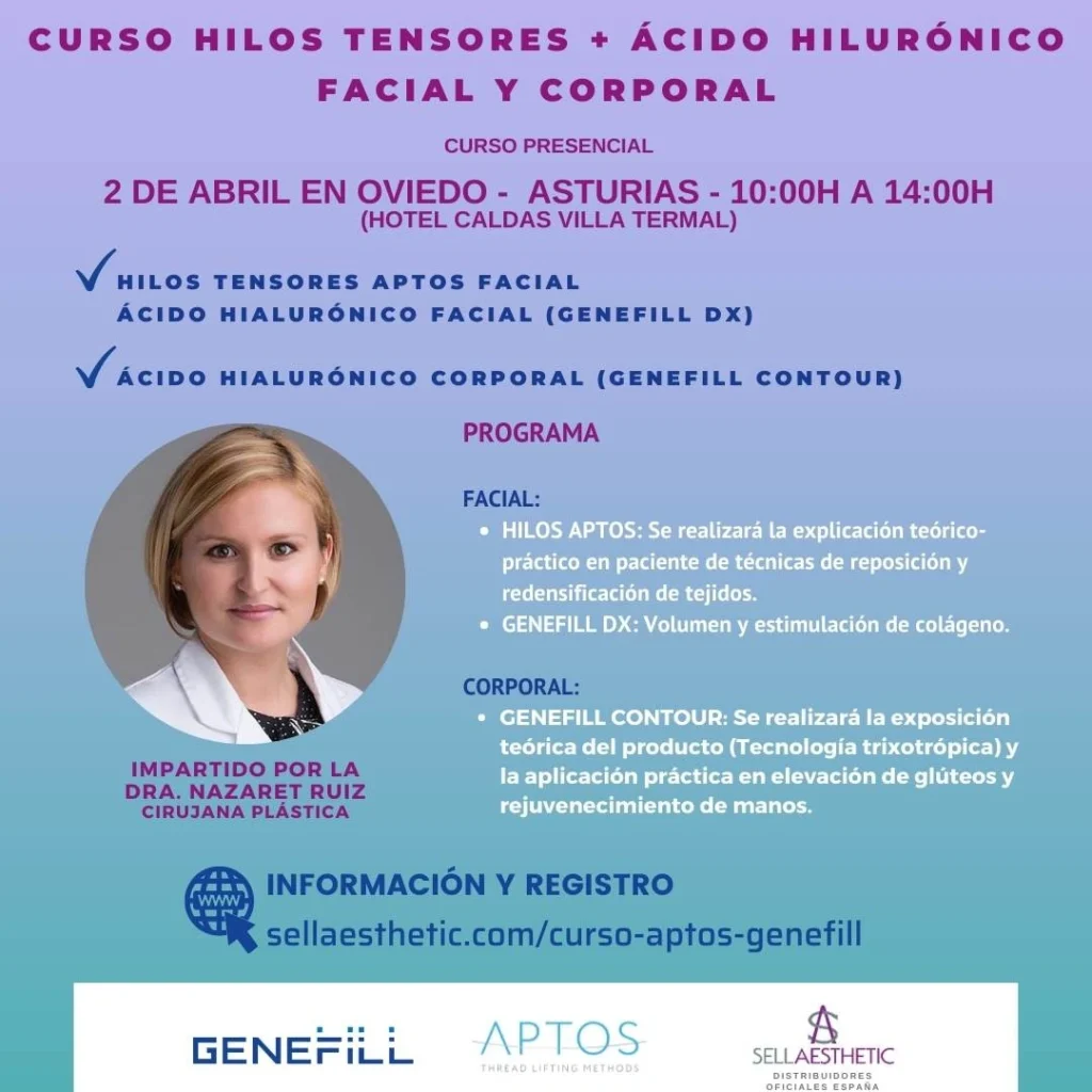 Formación hilos Aptos y rellenos dérmicos con Genefill facial y corporal en Asturias – 2 de abril 2022