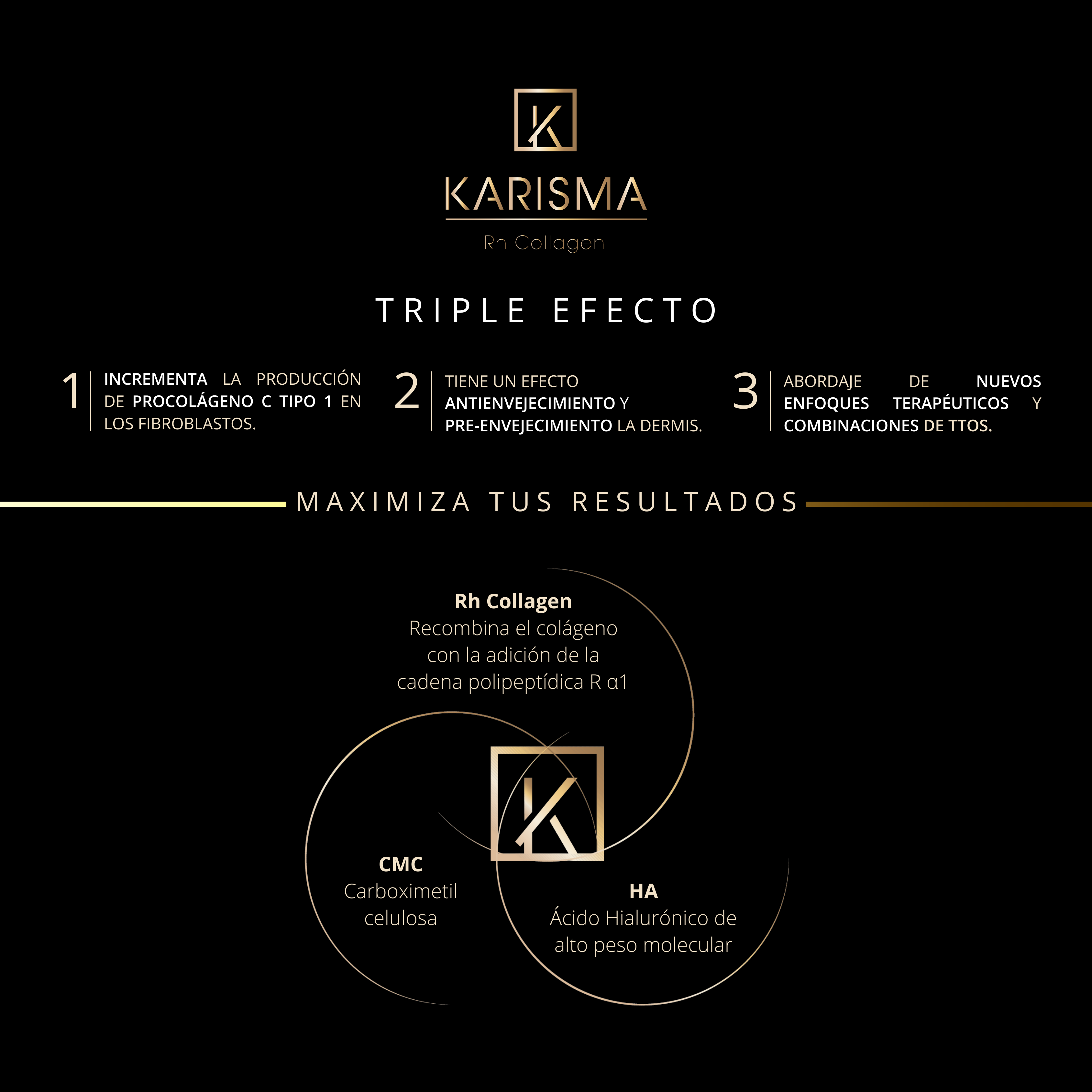 - Estimulación Natural: Karisma RH Collagen estimula la producción natural de colágeno en la piel, ayudando a restaurar la firmeza y elasticidad.
